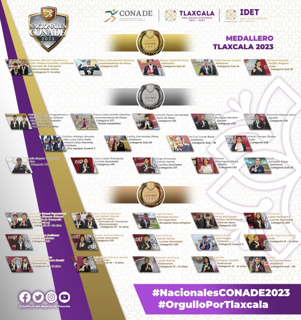 La selección tlaxcalteca aumentó el nivel competitivo durante su participación en Nacionales Conade 2023, al cosechar 35 medallas: cinco oros, 15 platas y 15 bronces, resultado que ubicó a la entidad en el lugar 32 del medallero nacional. Los 206 deportistas que dignamente representaron al estado se enfrentaron a competidores de 37 entidades deportivas, durante la justa que tuvo como sedes los estados de Tabasco, Aguascalientes, Morelos, Nayarit y Jalisco.