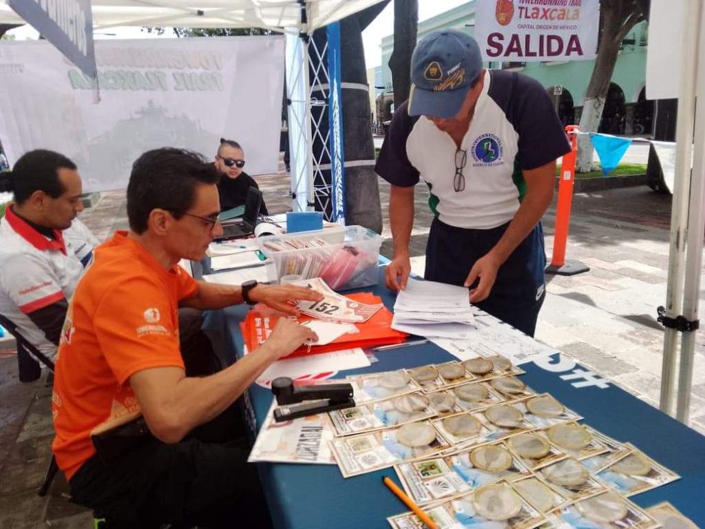 En la plaza de la constitución, se realizan inscripciones y entrega de kits de la Carrera #TowerrunningTrailTlaxcala2023, que organizan de manera conjunta el Ayuntamiento de Tlaxcala y la Federación Mexicana de esta modalidad deportiva.