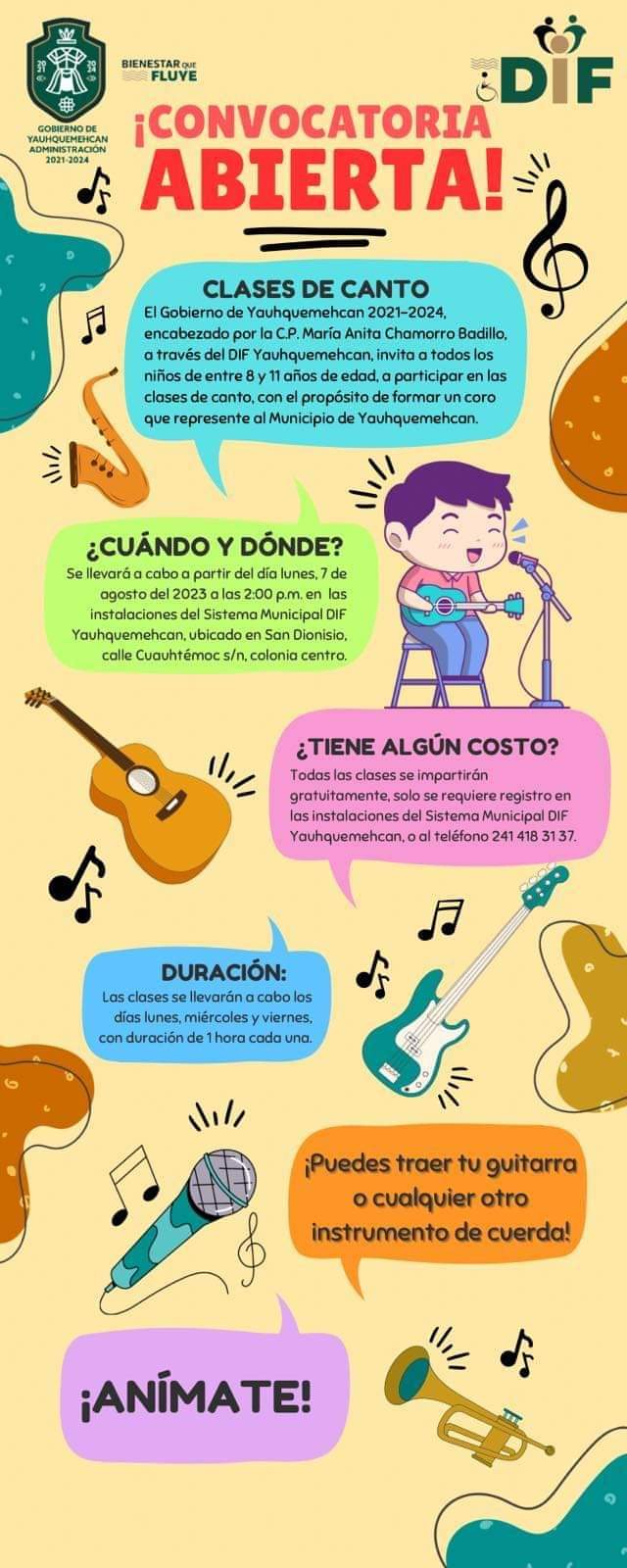 Aún estás a tiempo de inscribirte, ven a las oficinas del SMDIF Yauhquemehcan ubicadas en la calle Cuauhtémoc s/n o llama al número: 2414183137 para obtener más información. Recuerda que este curso es completamente gratuito y está abierto para todos los niños de 8 a 11 años de edad, con o sin experiencia. ¡Anímate a descubrir y desarrollar tu talento vocal junto a profesionales en un ambiente amigable y divertido! No pierdas esta oportunidad única de mejorar tus habilidades vocales y explorar el mundo de la música. ¡Te esperamos con entusiasmo en el inicio de esta emocionante experiencia!