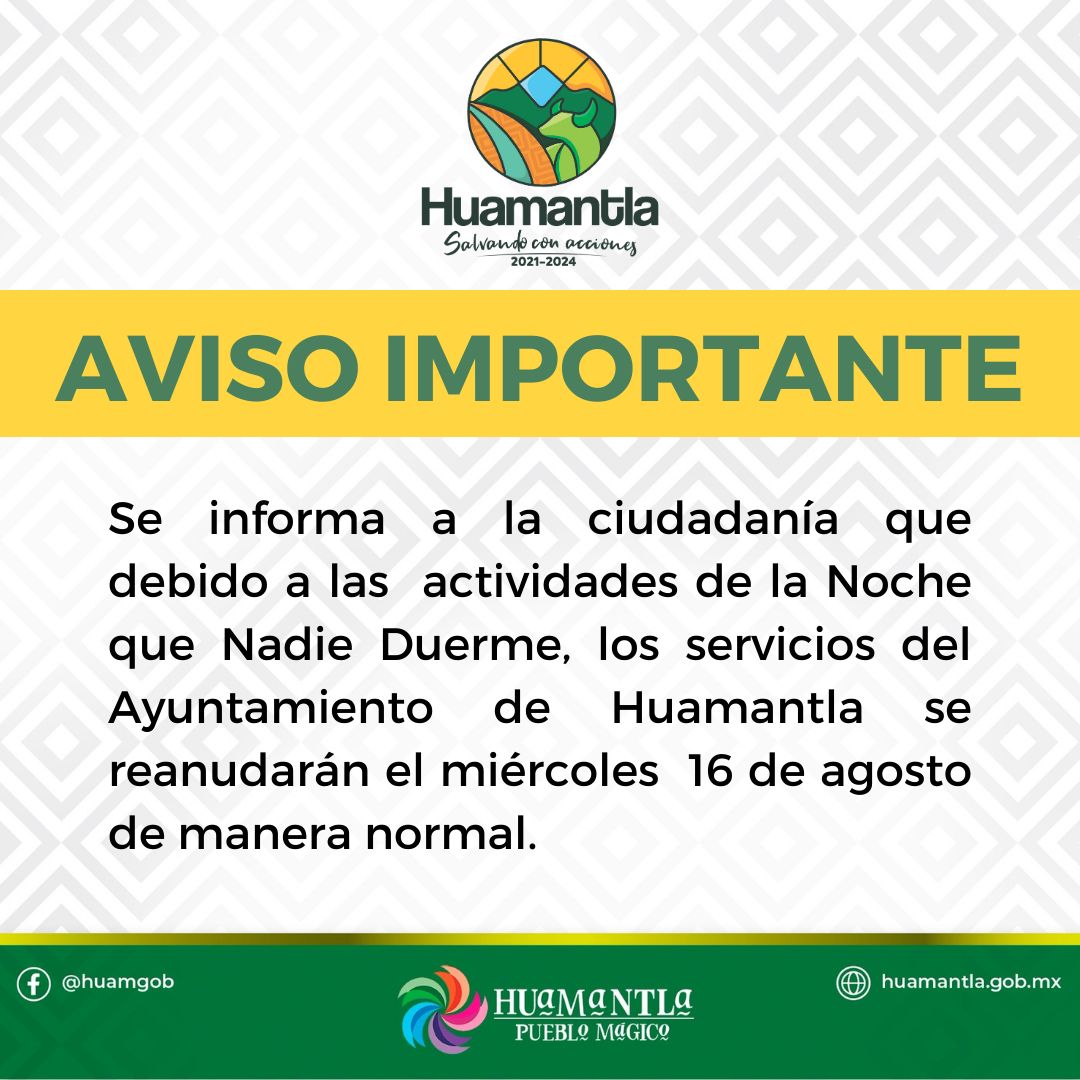 Derivado de las festividades en honor a la Virgen de La Caridad y de la tradicional “Noche que nadie duerme”, el H. Ayuntamiento de Huamantla, informa a toda la ciudadanía que los servicios de atención al público se suspenden durante los días 14 y 15 de agosto, reanudando actividades el próximo miércoles 16, en el horario habitual.