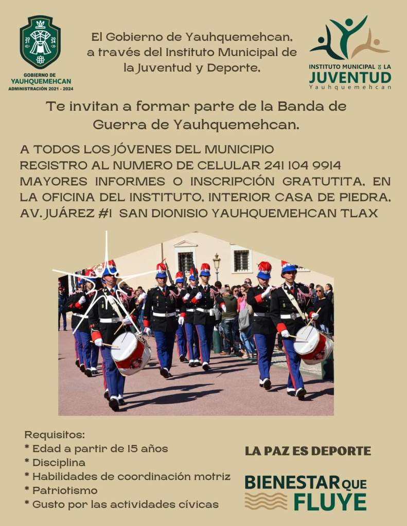 El Gobierno de Yauhquemehcan 2021-2024, a través del Instituto Municipal de la Juventud y Deporte, abre la siguiente convocatoria, dirigida a todos los jóvenes @seguidores que deseen ser parte de la Banda Guerra Municipal Bicentenario ¡CUPO LIMITADO!