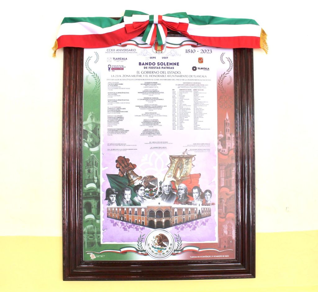 El Ayuntamiento de Tlaxcala Capital dio cumplimiento a su responsabilidad cívica con la colocación del Bando Solemne de Fiestas Patrias para anunciar las celebraciones que se llevarán a cabo durante el mes de septiembre, con motivo del CCXIII Aniversario del Inicio de la Independencia Nacional.
