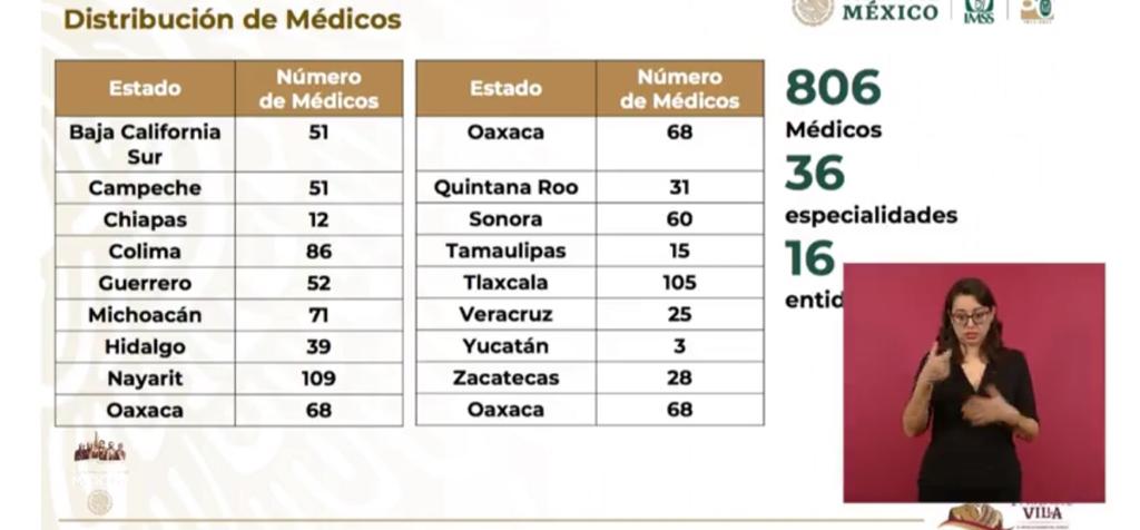 La distribución de médicos cubanos es de 109 en Nayarit, 105 en Tlaxcala, 68 en Colima, 71 en Michoacán, 68 en Oaxaca, 60 en Sonora, 52 en Guerrero, 51 en Campeche y Baja California Sur, 39 en Hidalgo, 31 en Quintana Roo, 28 en Zacatecas, 25 en Veracruz, 15 en Tamaulipas, 12 en Chiapas y tres en Yucatán.