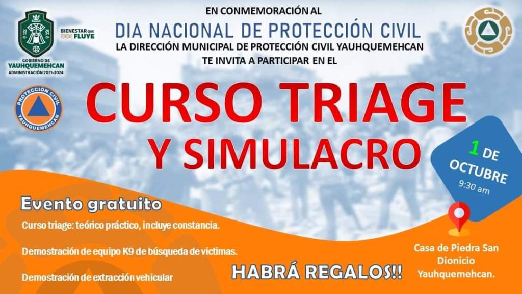 Te invitamos este 1 de octubre al Curso Triage y Simulacro por parte de la dirección de protección civil del Gobierno de Yauhquemehcan 2021-2024 totalmente gratuito.