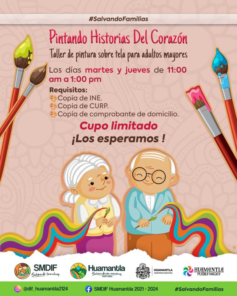 Con la finalidad de ofrecer actividades de entretenimiento y aprendizaje, el Sistema Municipal para el Desarrollo Integral de la Familia (SMDIF) Huamantla, invita a los adultos mayores del municipio al taller denominado “Pintando Historias del Corazón”, que se impartirá de manera gratuita a partir de este martes 26 de septiembre.