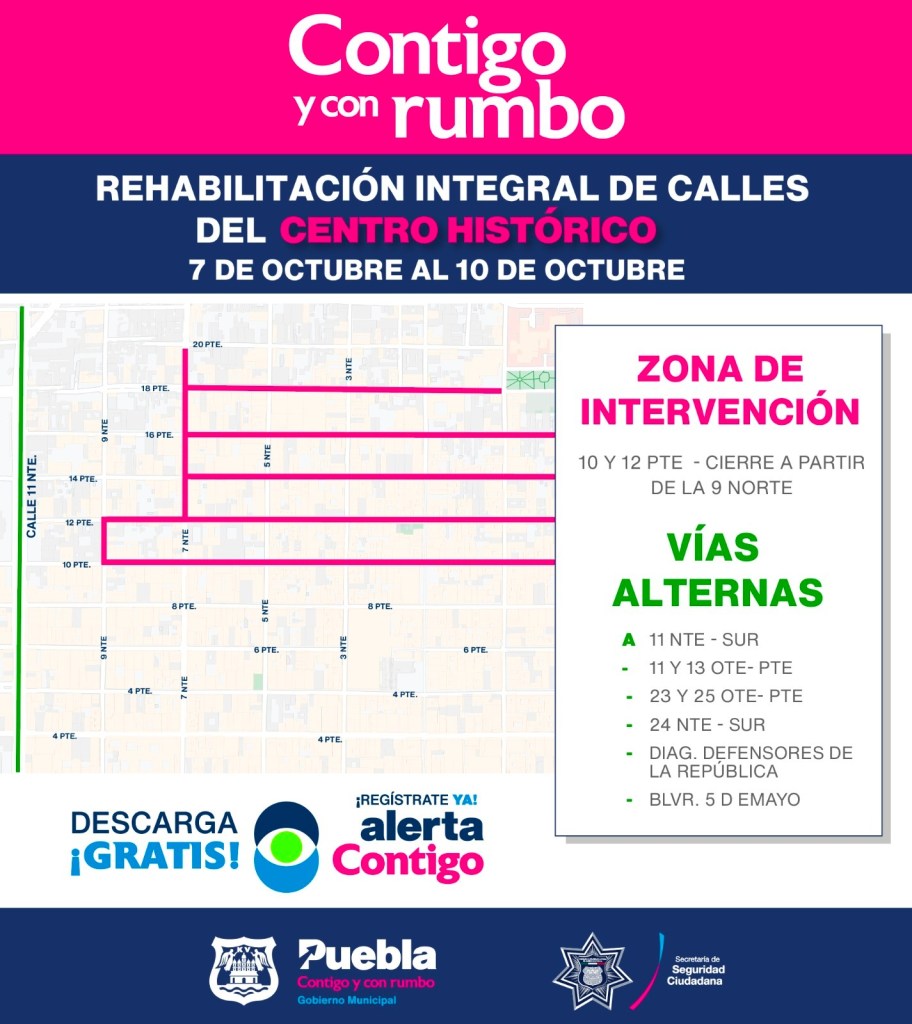 *CERRARÁN CRUCEROS DE LA 9 NORTE CON LA 10 Y 12 PONIENTE POR TRABAJOS DE MANTENIMIENTO INTEGRAL DEL CENTRO HISTÓRICO*_- A partir de este sábado 7 y hasta el próximo martes 10 de octubre se desarrollarán las últimas labores de rehabilitación._Como parte de los trabajos de rehabilitación de las calles del Centro Histórico, el Ayuntamiento de Puebla -presidido por Eduardo Rivera Pérez- a partir de este 07 de octubre se realizan cierres en los cruceros de las avenidas 10 y 12 Poniente con calle 9 Norte.En los cruceros se efectuarán trabajos de restitución del pavimento actual con el objetivo de mejorarlos y dejarlos en perfectas condiciones, y serán liberados para la circulación vehicular el martes 10 de octubre a las 09:00 horas.Estos trabajos pertenecen a la última etapa del programa integral de mantenimiento de las calles del Centro Histórico, mismo que incluyó la sustitución y renovación del drenaje, así como del concreto y adoquín de las avenidas 10, 12, 14, 16 y 18 Poniente-Oriente. Las y los conductores de vehículos podrán acceder a esta zona por vías alternas: 11 y 24 Norte-Sur, Diagonal Defensores de la República, Bulevar Héroes del 5 de Mayo, 11, 13, 23 y 25 Oriente-Poniente.