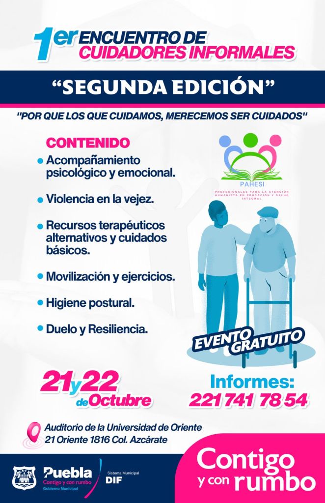 Con el objetivo de brindar un acompañamiento integral que apoye las necesidades de las y los familiares de personas con alguna discapacidad o que se encuentran en situación de atención prioritaria, Liliana Ortiz Pérez, Presidenta Honoraria del Sistema Municipal DIF (SMDIF) de Puebla, anuncia que se sumarán al ‘1er Encuentro de Cuidadores Informales’ organizado por la asociación ‘Profesionales para la Atención Humanista en Educación y Salud Integral’ (PAHESI).