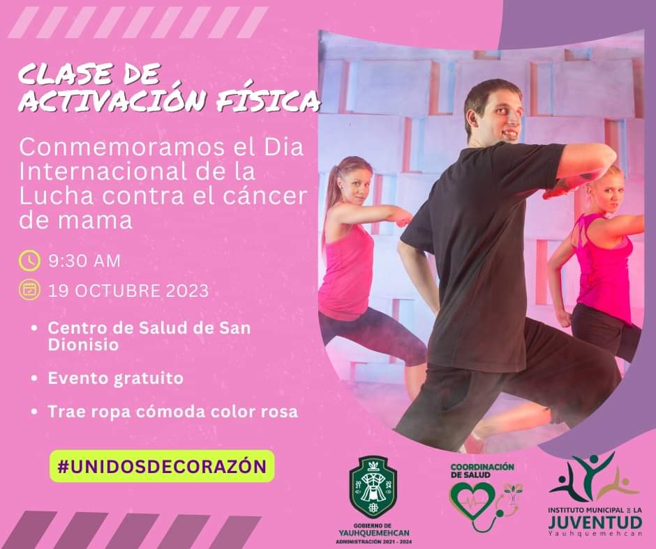 La coordinación de salud y el instituto de la juventud y deporte del Gobierno de Yauhquemehcan 2021-2024 invitan a las mujeres del municipio a la «Clase de Activación Física, conmemoramos el Día Internacional de la Lucha contra el cáncer de mama» . en el centro de Salud de la cabecera municipal San Dionisio.