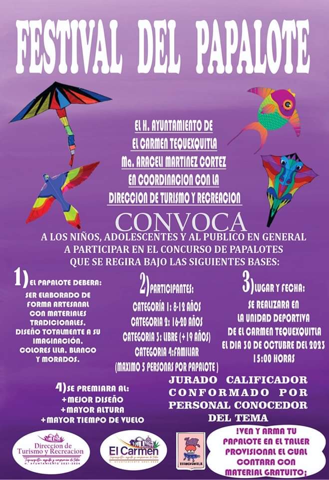 El Honorable Ayuntamiento de el Carmen Tequexquitla encabezado por la C. Araceli Martínez Cortéz en coordinación con la Dirección de Turismo y Recreación. 🪁🪁🪁🪁 #CONVOCAN 🪁🪁🪁🪁