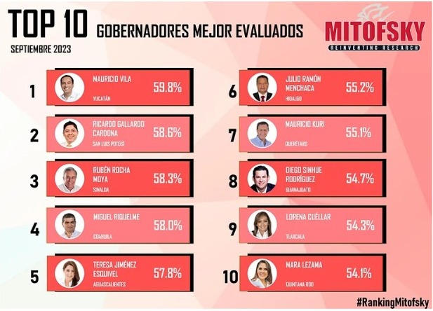 Los resultados “Aprobación ciudadana, Gobernadoras y Gobernadores de México” (septiembre 2023), reflejan que la aprobación promedio se mantiene dentro de los primeros 10 lugares con más del 50 por ciento, lo que coloca a Cuéllar Cisneros por arriba de la media con la que fueron calificados la mayoría de sus homólogos.