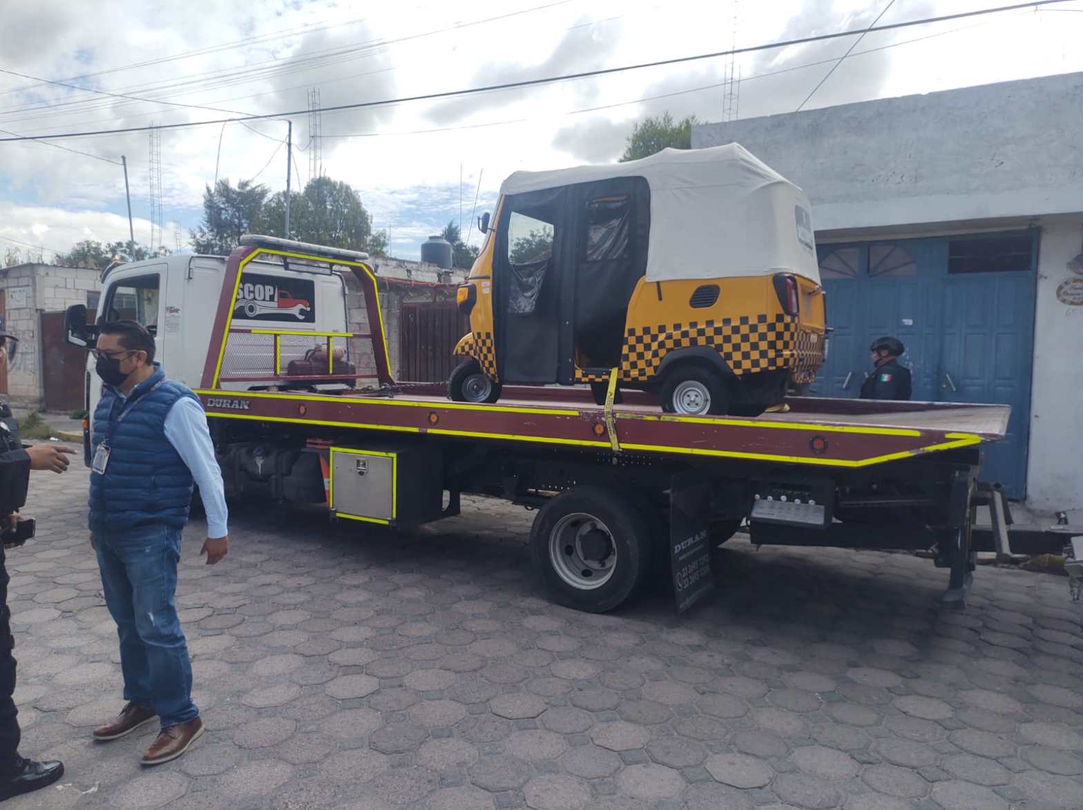 En supervisión y vigilancia realizada por los inspectores adscritos a la SMyT, se detectó que sobre la carretera Vía Corta Santa Ana Chiautempan-Puebla,esquina con privada Ayuntamiento del Barrio de San Sebastián, municipio de San Pablo del Monte, circulaba una unidad tipo mototaxi color amarillo y cuadros negros con toldo blanco, la cual era utilizada para el traslado de dos personas del sexo femenino, por lo que el personal de inspección procedió al aseguramiento de la unidad.