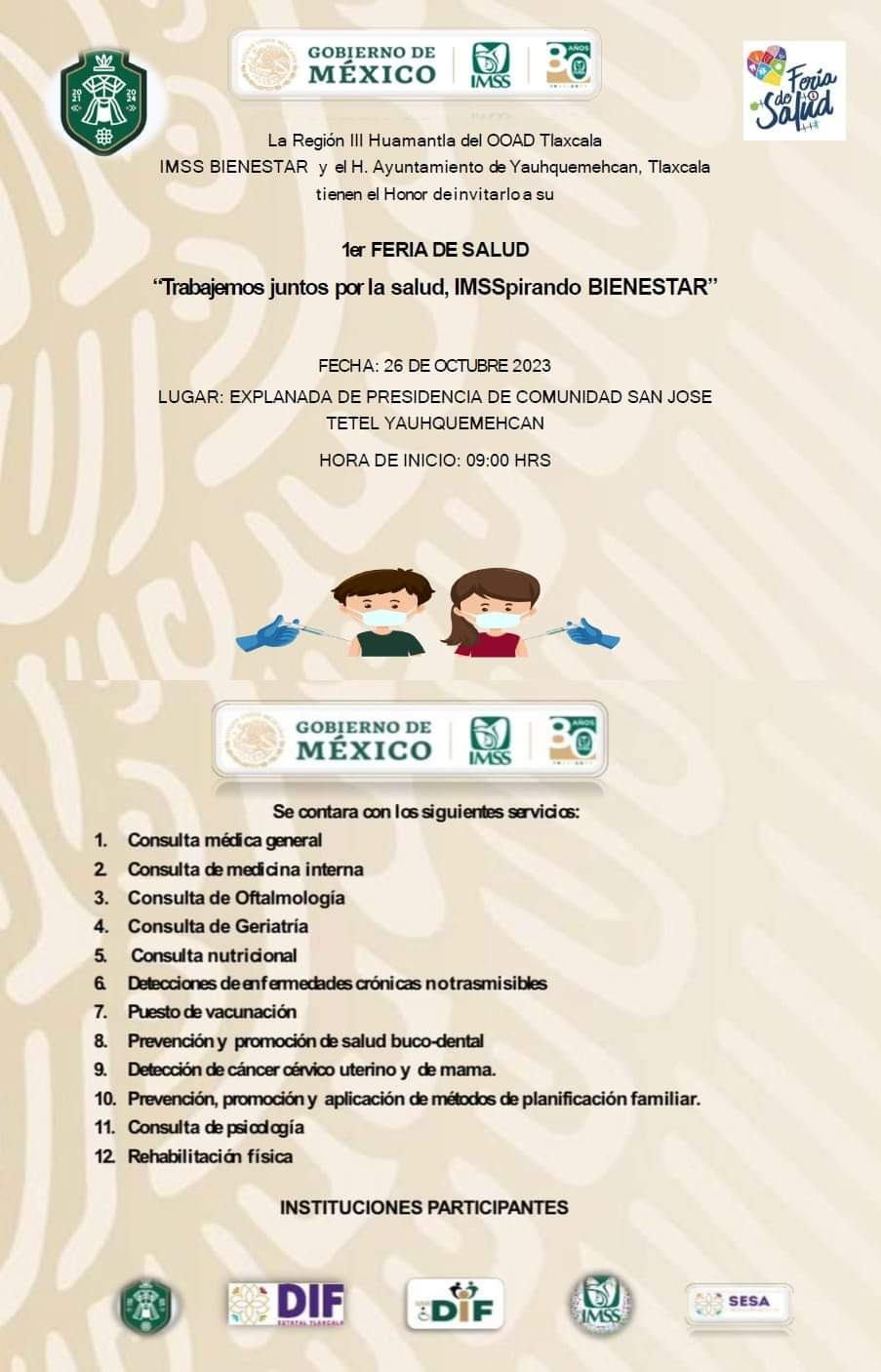 La Coordinación de Salud del Gobierno de Yauhquemehcan 2021-2024 , informa sobre la 1er. Feria de Salud de especialidades médicas, en colaboración con IMSS-BIENESTAR, de manera gratuita, es indispensable llevar copia de CURP y cartilla de vacunación.