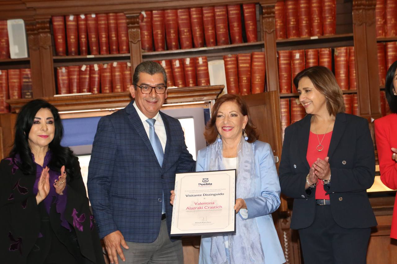 Como un reconocimiento a su trayectoria y a su labor informativa, el Gobierno Municipal -presidido por Eduardo Rivera Pérez- entregó la condecoración de ‘Visitante Distinguido’ a Valentina Alazraki Crastich -Periodista, Escritora y Conferencista Mexicana-, destacada por cubrir los principales sucesos del Vaticano desde los años setentas.