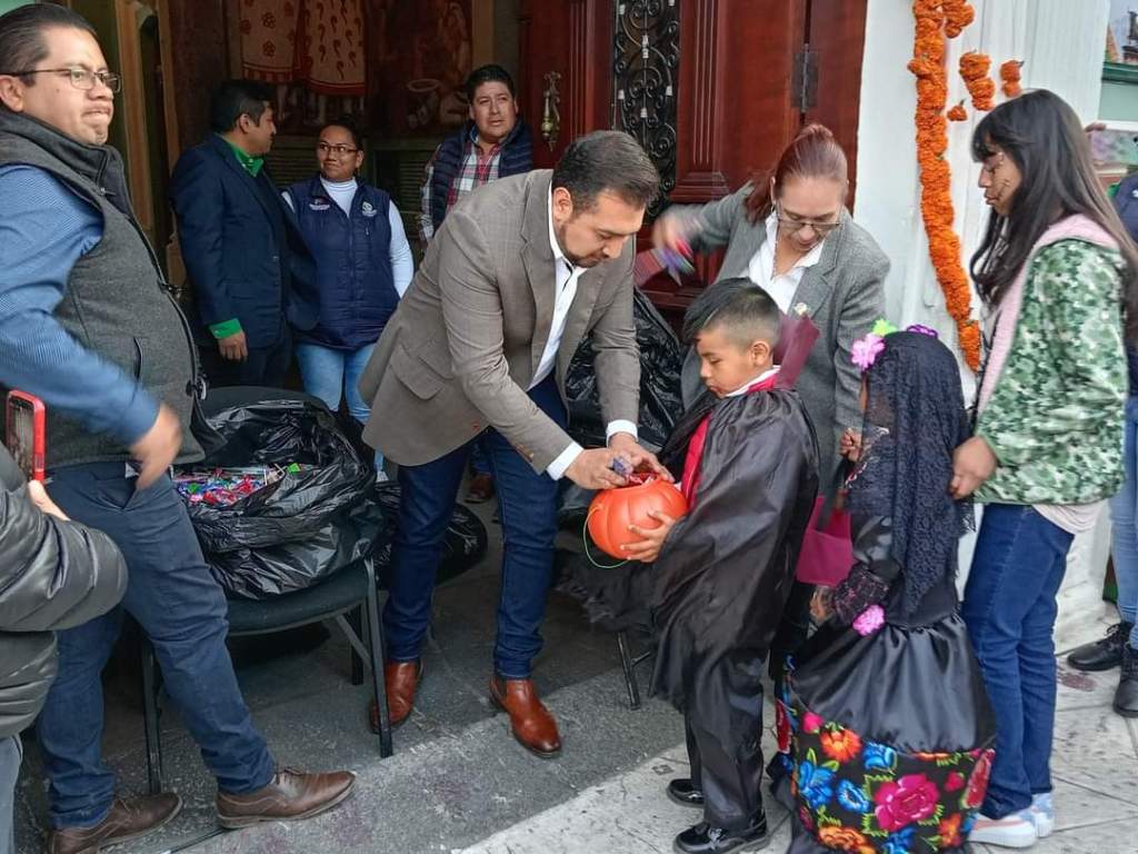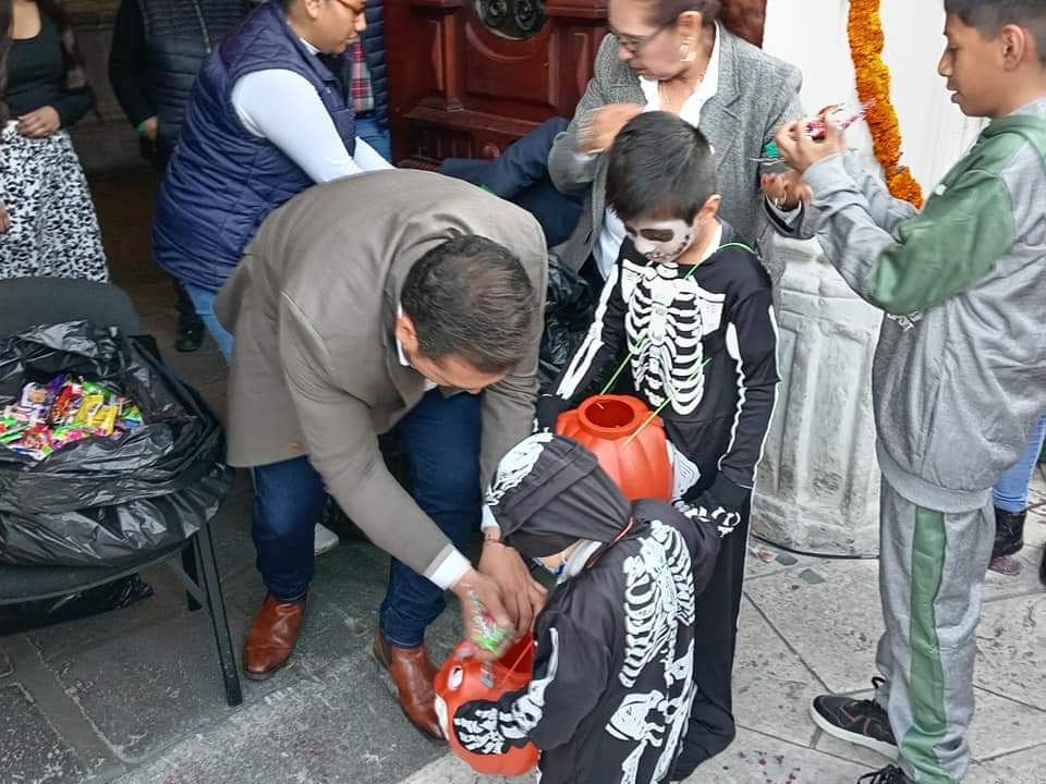Siguiendo las tradiciones del dia 1 de noviembre, donde los niños se disfrazan y piden su calaverita, el alcalde de Huamantla Salvador Santos Cedillo entrego dulces a los pequeños afuera de la presidencia.