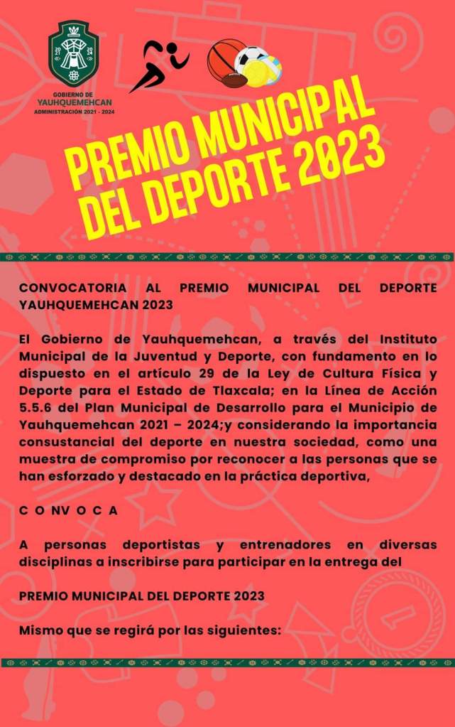 Es tu momento para que participes para el premio municipal del deporte Yauhquemehcan 2023, si eres deportista o entrenador te invitamos a que hagas entrega de tu documentación y participes. 🎖️🏀⚽️