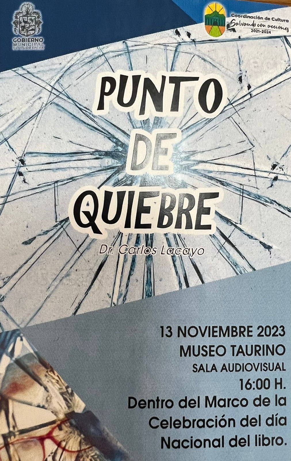 Como parte de la conmemoración del Día Nacional del Libro en México, el H. Ayuntamiento de Huamantla, a través de la Coordinación de Cultura, realizará la presentación del libro «Punto de Quiebre», del autor Carlos Lacayo Hernández.