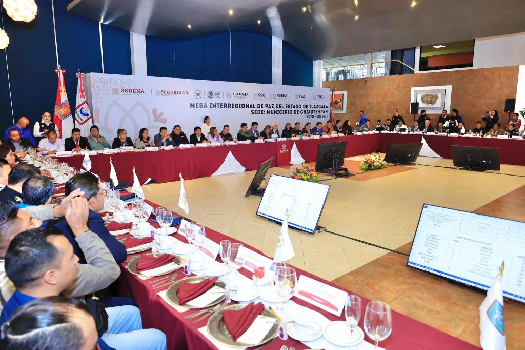 La Gobernadora Lorena Cuéllar Cisneros encabezó este martes la Mesa Interregional de Paz del estado de Tlaxcala, en la que participaron alcaldes de los 60 municipios e integrantes del Gabinete de Seguridad, con el propósito de fortalecer la coordinación para mantener a la entidad con los más bajos índices delictivos.
