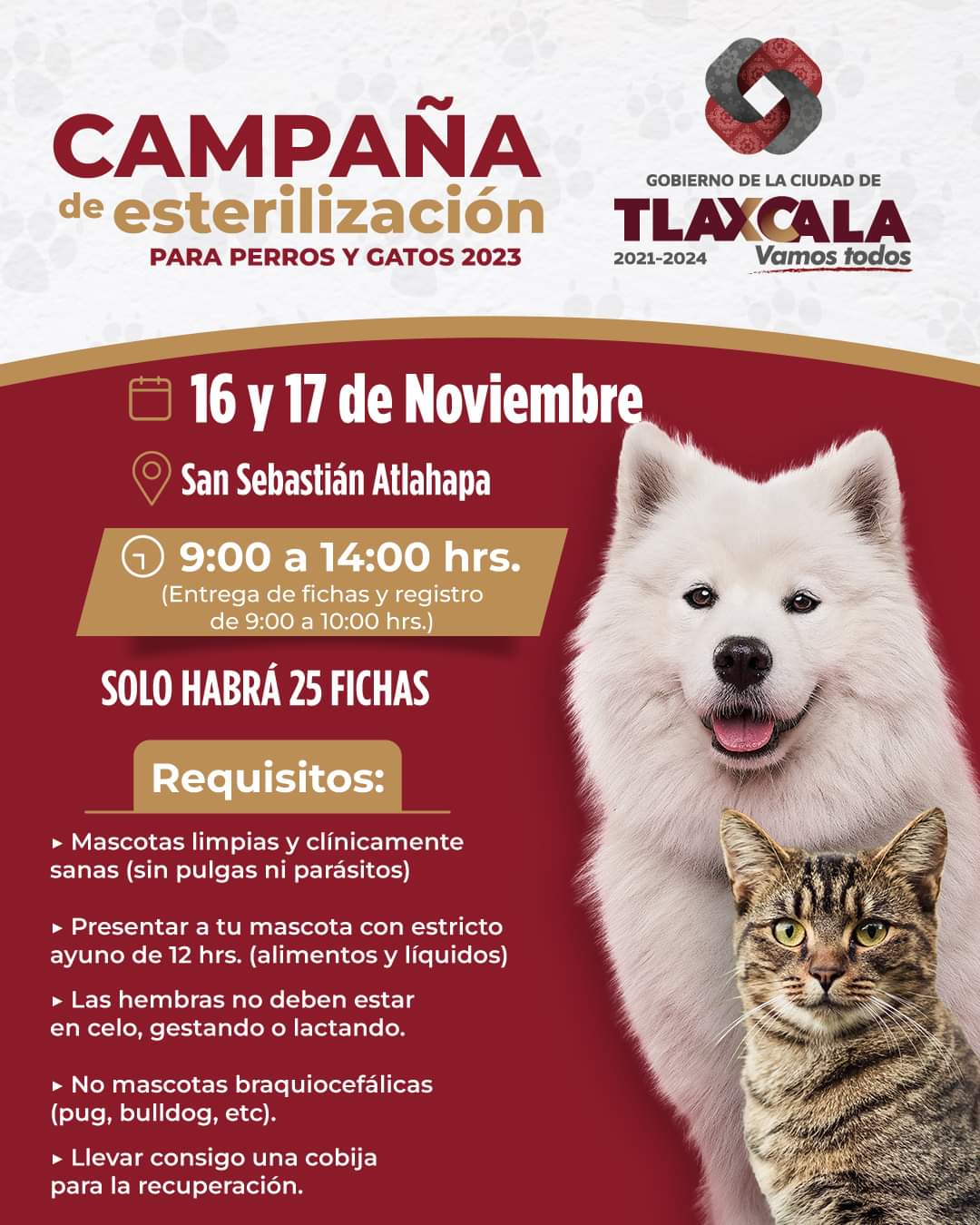 ¡Únete a la campaña de esterilización de mascotas! Te invitamos cordialmente a participar en la jornada que se llevará a cabo los días 16 y 17 de noviembre en San Sebastian Atlahapa. Ven a la presidencia de comunidad entre las 9:00 y las 14:00 horas para asegurar una de las 25 fichas disponibles por día y así garantizar el procedimiento para tu mascota. Tu contribución es vital para el bienestar animal. ¡Te esperamos!