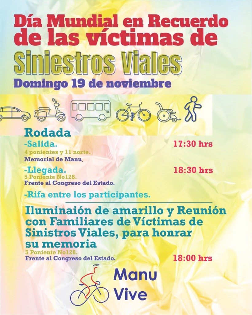 Las acciones planeadas por MANU VIVE incluyen una rodada con BICIÓPOLIS el viernes 17 de noviembre, partiendo desde el Zócalo de Puebla a las 20:45 horas. Mientras que el domingo 19, se llevará a cabo la ceremonia del 5° aniversario luctuoso de Manu en la explanada del Mercado de Sabores a las 11:00 horas para, posteriormente, a las 15:30 horas comenzar con diversos eventos.