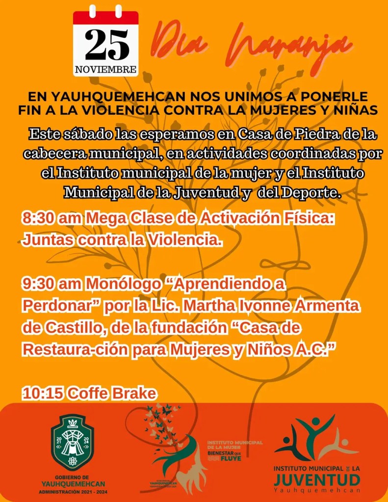 🟠🖐 Día Naranja🖐🟠|| 🧡Como parte de las acciones gubernamentales que nos permitan visibilizar, disminuir y erradicar la violencia de género, este 25 de Noviembre el Gobierno de Yauhquemehcan, te invitan a participar en las actividades preparadas para ti, en conmemoración de la fecha.