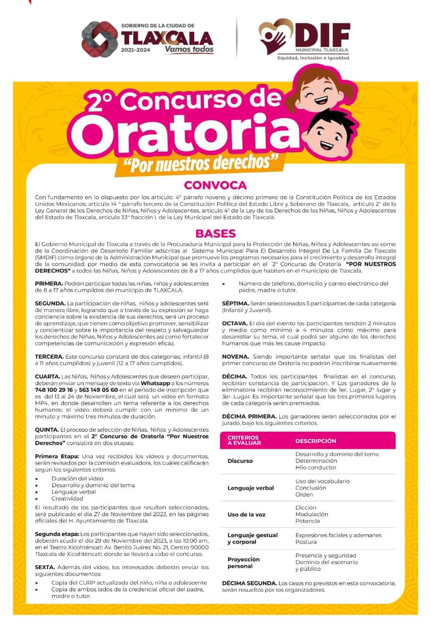 El Sistema DIF Municipal convoca al Segundo Concurso de Oratoria «Por Nuestros Derechos», dirigido a niñas, niños y adolescentes de 8 a 17 años que radiquen en el municipio de Tlaxcala.