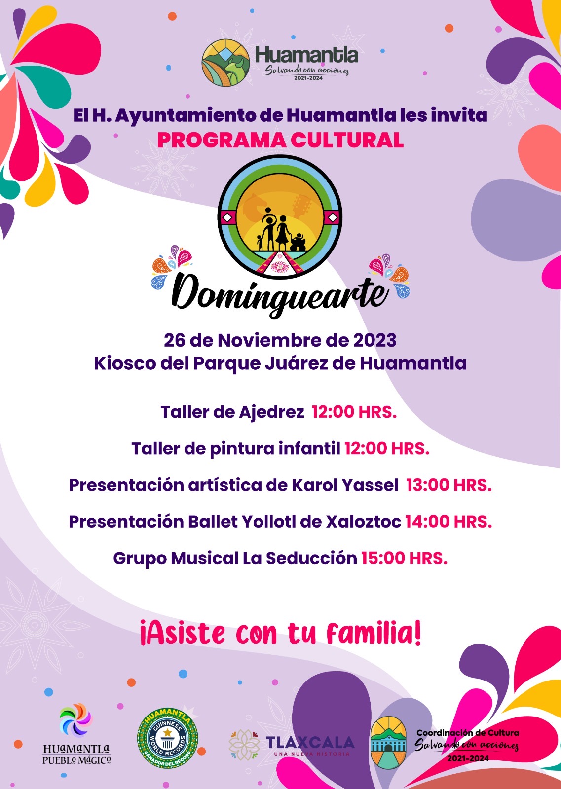El H. Ayuntamiento de Huamantla que preside Salvador Santos Cedillo, a través de la Coordinación de Cultura, impulsa cada domingo el programa “Dominguearte”, donde se presenta una cartelera artística y cultural llena de actividades dinámicas para chicos y grandes.