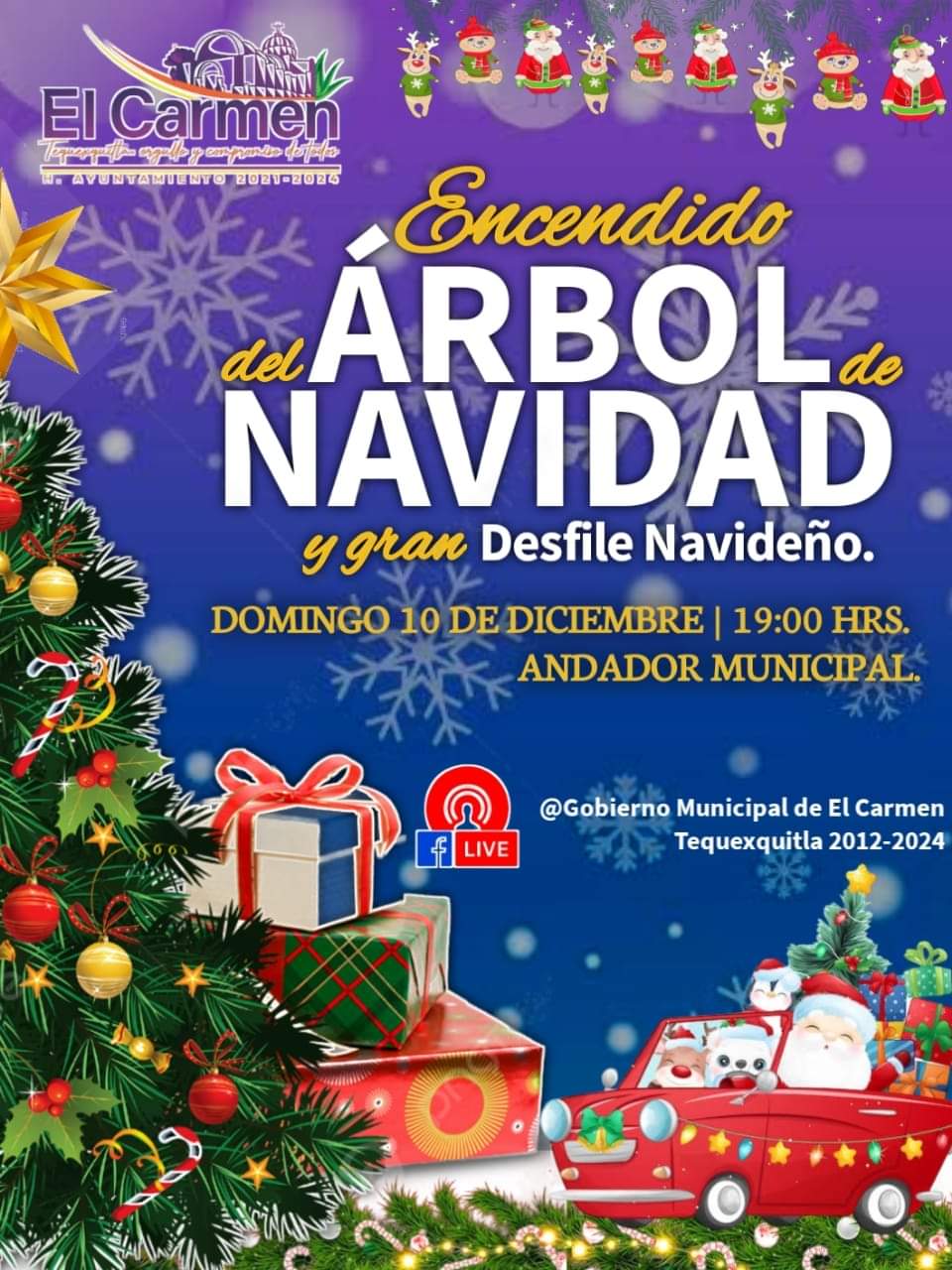 La Presidenta Municipal La C.Ma.Araceli Martínez Cortez y El Honorable Ayuntamiento de El Carmen Tequexquitla 2021-2024 hacen la atenta invitación a toda la población en general para presenciar este mágico encendido del árbol navideño el próximo: