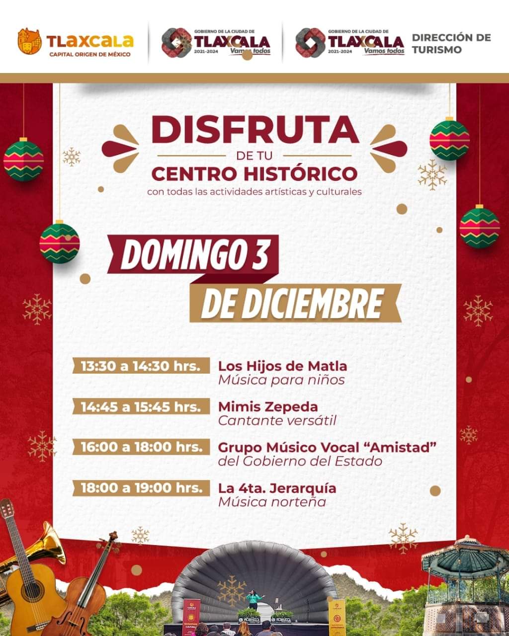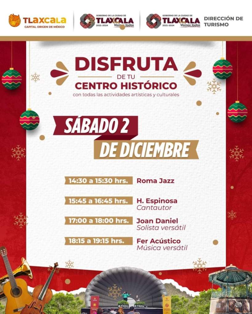 Para iniciar el ultimo mes del año 2023, el Ayuntamiento de Tlaxcala, organiza una serie de actividades artísticas y culturales, con la intención de que las y los capitalinos, asi como los visitantes, puedan disfrutar del Centro Historico de Tlaxcala Capital.