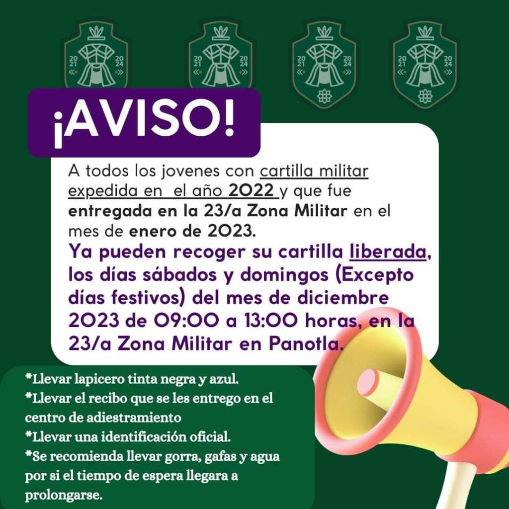 ATENCIÓN YAUHQUEMEHCAN YA PUEDES RECOGER TU CARTILLA MILITAR Publicado porEXPRESION3 de diciembre de 2023Publicado en Edo Tlaxcala, Noticias, Yauhquemehcan 3 DE DICIEMBRE 2023 AtentoAviso Ya puedes recoger tu cartilla militar expedida en el año 2022. Toda la información 👇👇👇 Comparte esto: Haz clic para compartir en X (Se abre en una ventana nueva) X Haz clic para compartir en Facebook (Se abre en una ventana nueva) Facebook Me gusta Cargando... Relacionado