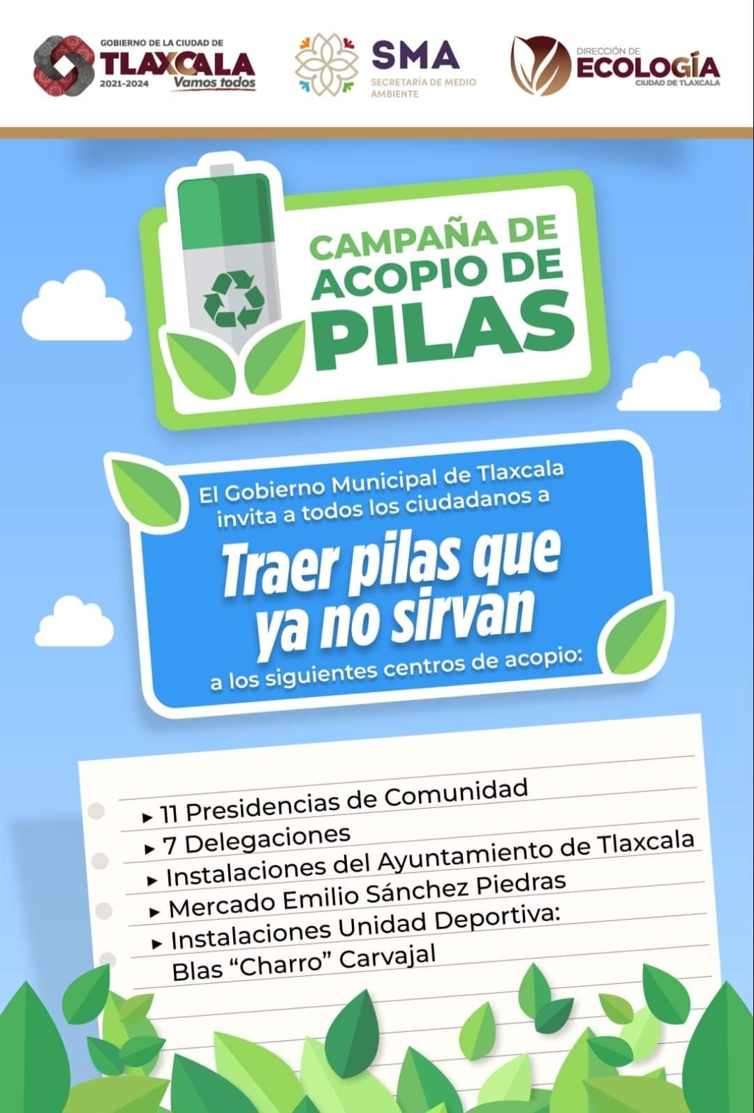 El cuidado de nuestro entorno es tarea de todos, ¡y tú puedes ser parte del cambio! 🌍🌱 El Ayuntamiento de Tlaxcala te invita a sumarte a nuestra campaña de recolección de pilas usadas. 🔄