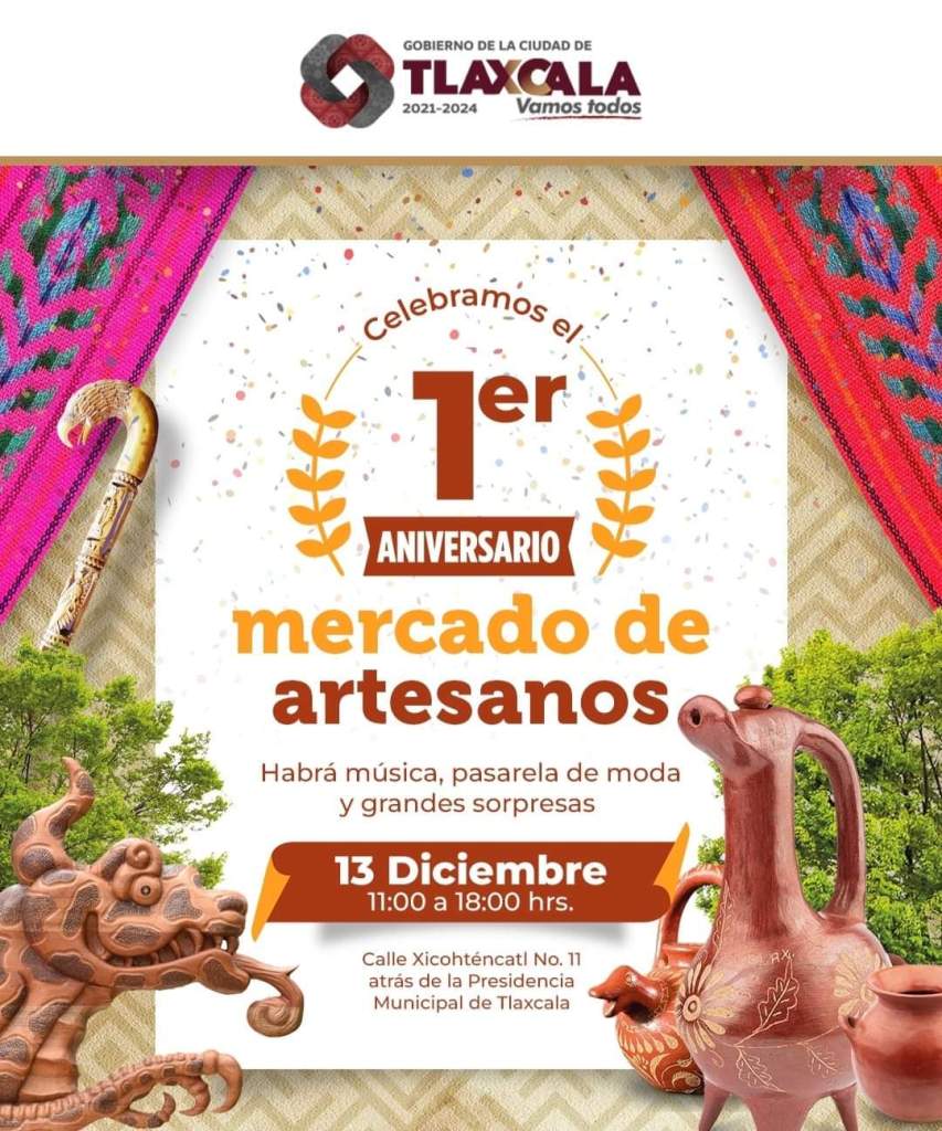 Vive con nosotros, el Ayuntamiento de Tlaxcala, el primer aniversario de nuestro mercado de artesanos, el próximo 13 de diciembre de 11:00 a 18:00 horas con diversas actividades.