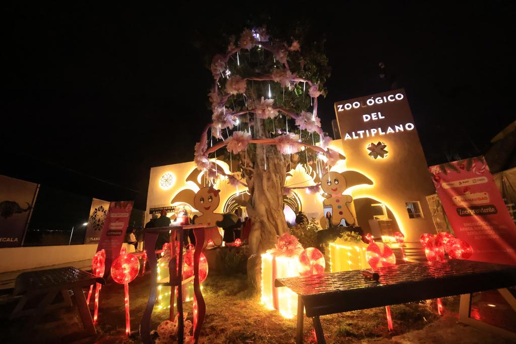 La gobernadora Lorena Cuéllar Cisneros, acompañada de la directora del Instituto de Fauna Silvestre de Tlaxcala (Ifast), Sonia Tepatzi Carranco, encendió el árbol navideño que por primera vez ilumina el Zoológico del Altiplano.