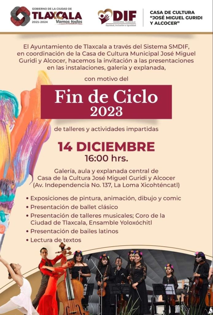 🎉 La Casa de Cultura Municipal Miguel Guridi y Alcocer realizará diversas actividades con motivo del cierre de ciclo 2023. Se invita a toda la comunidad a acompañarnos el próximo 14 de diciembre a las 16:00 horas para apreciar el trabajo de las y los alumnos de este espacio cultural.