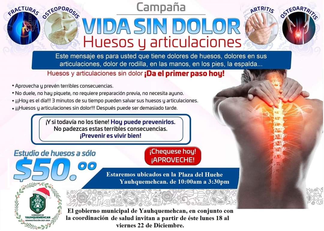 El Gobierno de Yauhquemehcan 2021-2024 a través de la Coordinación de salud, te invita, a la Jornada de Salud vida sin dolor, huesos y articulaciones, acude a tomar una densitometría ósea y factor reunatoide.