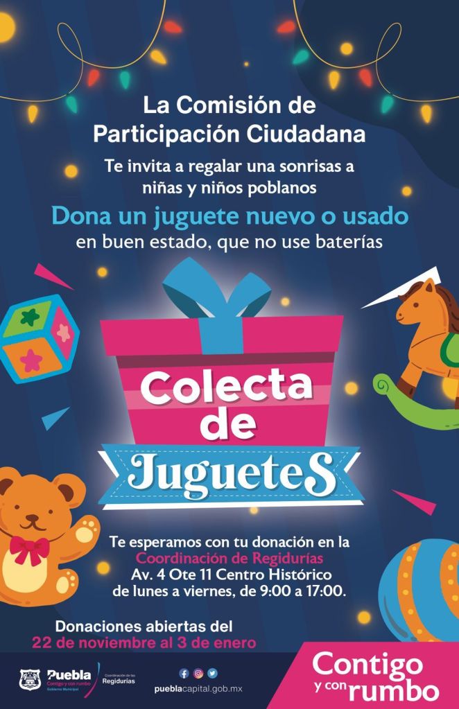 Es así que la población interesada en sumarse a esta causa podrá hacer entrega de juguetes nuevos o usados en buen estado -que no usen baterías- en las oficinas ubicadas en 4 Oriente No. 11, Centro Histórico, en un horario de 9:00 a 17:00 horas.