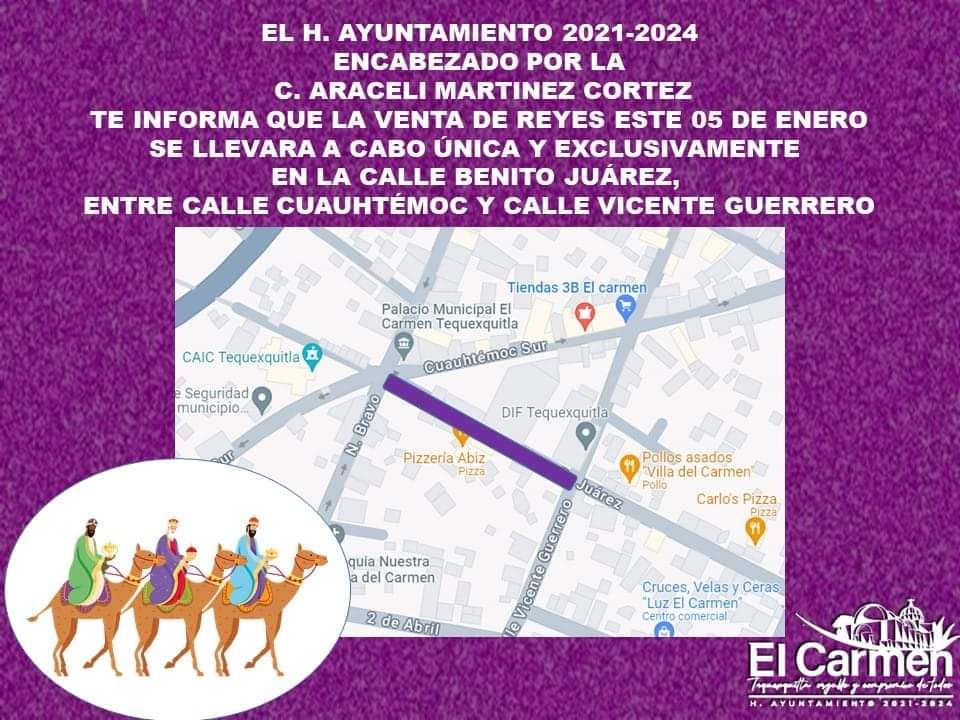 EL GOBIERNO MUNICIPAL INFORMA QUE LA VENTA DE REYES SE UBICARÁ ESTE PRÓXIMO 05 DE ENERO EN CALLE BENITO JUÁREZ (atrás de presidencia).