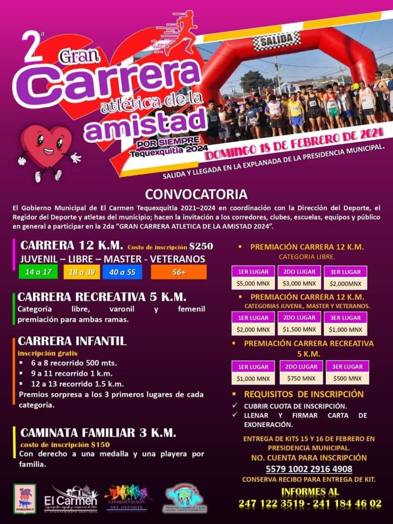 El Gobierno Municipal de El Carmen Tequexquitla 2021-2024, CONVOCA a todos los clubes deportivos, escuelas y población en general a registrarse en la 2da edición de la carrera atlética de la amistad.📣♥️🔥