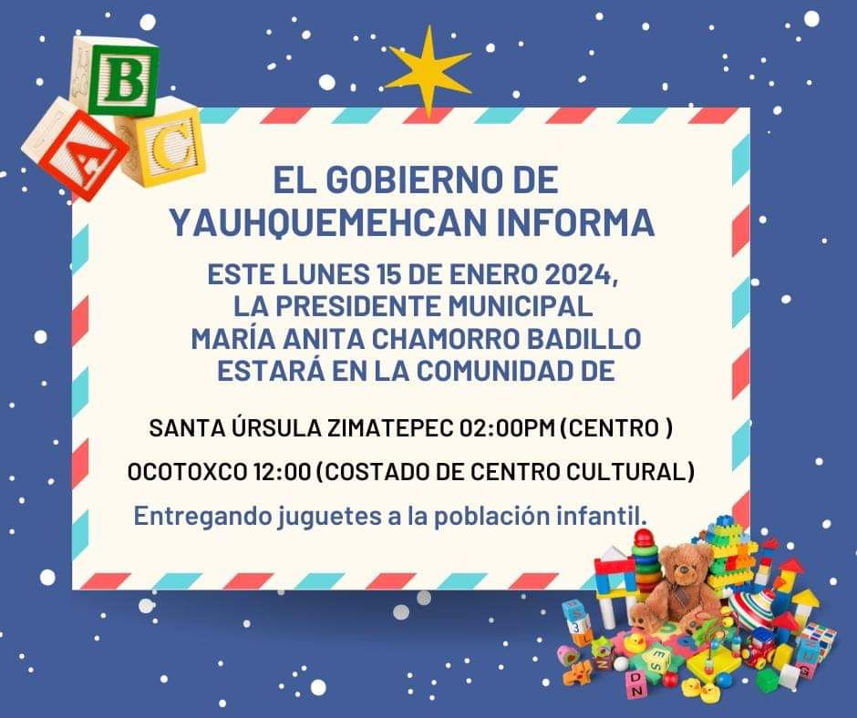 Estaremos con ustedes a las 2:00pm, entregando juguetes por parte de la presidente municipal María Anita Chamorro Badillo.