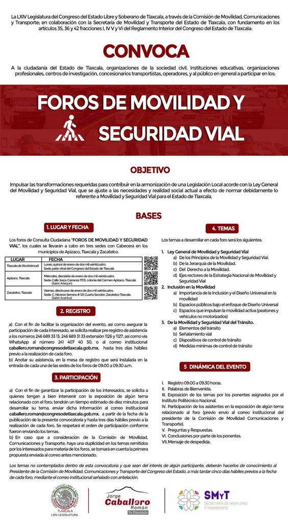La dependencia estatal informó que la LXIV Legislatura del Congreso del Estado a través de la Comisión de Movilidad, Comunicaciones y Transporte emitió la convocatoria invitando a la ciudadanía en general, organizaciones de sociedad civil, instituciones educativas, organizaciones profesionales, centros de investigación y sobre todo a concesionarios y operadores del transporte público para que participen con temas relacionados al foro que contribuya a la armonización de dicho marco normativo.