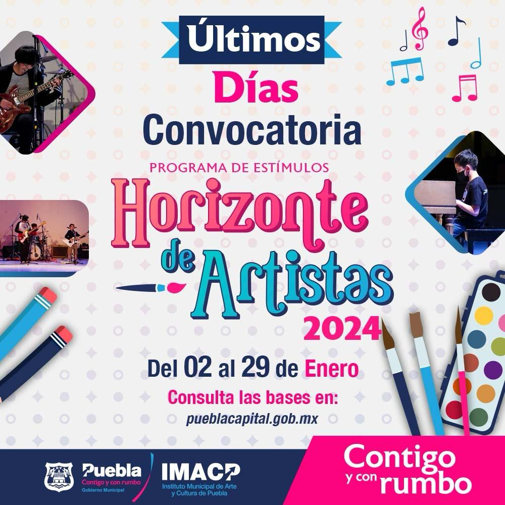 Además de esta convocatoria, el IMACP también mantiene abiertos los registros para “Horizonte de Artistas 2024”, programa que promueve la formación artística de niñas, niños y jóvenes de entre 5 y 17 años con estímulos económicos; las bases completas se encuentran en bit.ly/3NNwFHK y las inscripciones cierran este próximo 29 de enero.