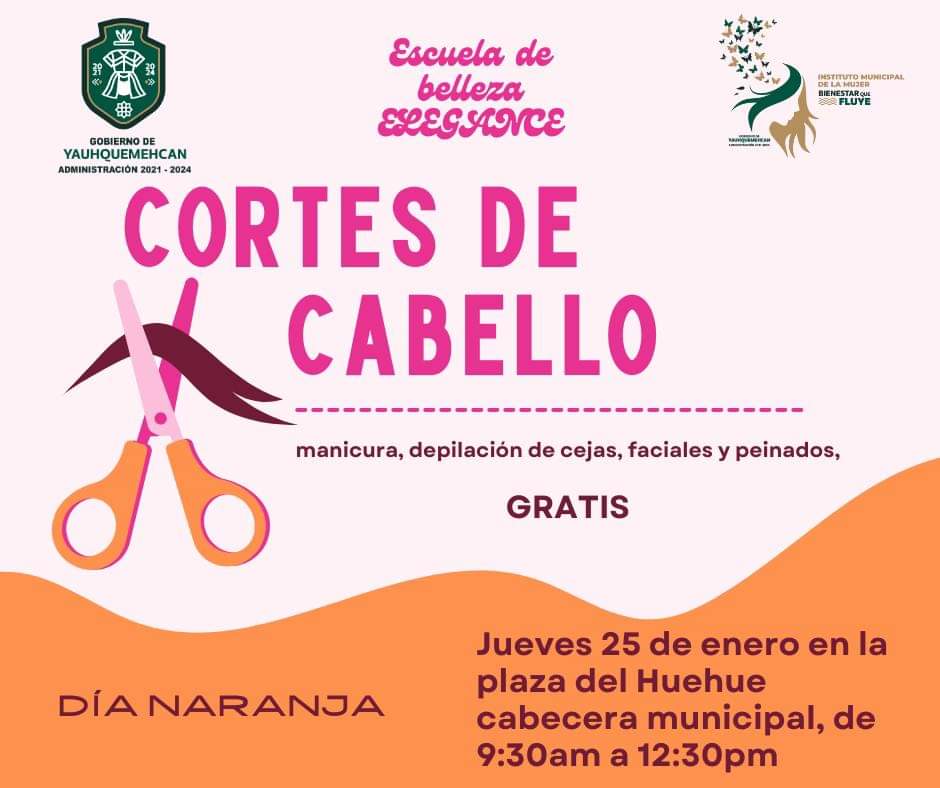 El instituto municipal de la mujer del Gobierno de Yauhquemehcan 2021-2024 , invita a toda la ciudadanía este jueves 25 de enero a la jornada de servicios que impartirá la escuela de belleza «Elegance», en la plaza del Huehue cabecera municipal, de 9:30am a 12:30pm , brindando a la ciudadanía de manera gratuita: cortes de cabello, manicura, depilación de cejas, faciales y peinados, bajo la dirección de la maestra Stephany García Muñoz. #DiNo #Unete ##DíaNaranja