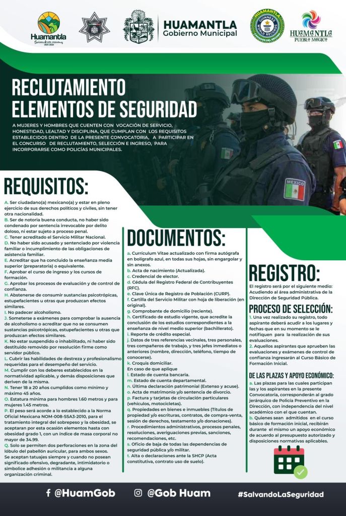 El gobierno de Huamantla, a través de la Dirección de Seguridad Pública, Tránsito y Protección Civil, convoca a mujeres y hombres a participar en la convocatoria para el proceso de selección e ingreso al cuerpo de seguridad, a fin de servir a su municipio con lealtad, honestidad y compromiso.
