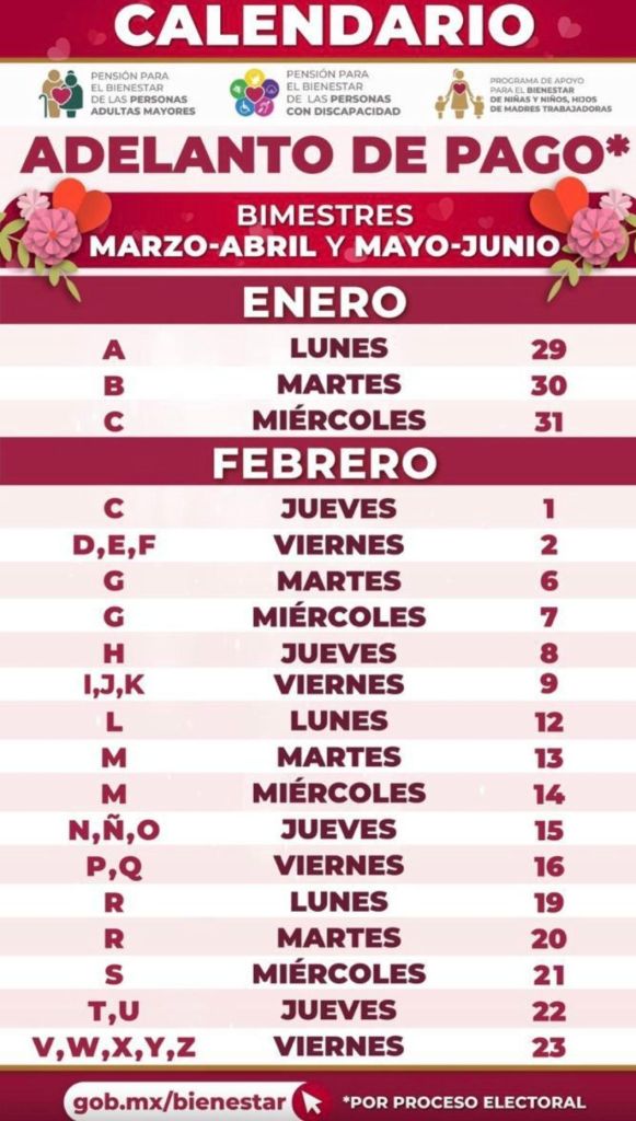Explicó que la dispersión bancaria del pago adelantado de dos bimestres por el periodo electoral será del 29 de enero al 23 de febrero en todo el país; los adultos mayores derechohabientes recibirán 12 mil pesos; las personas con discapacidad seis mil 200 pesos, mientras que los beneficiarios del programa de madres trabajadoras, tres mil 200 pesos.
