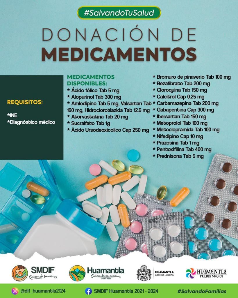 La directora del DIF Huamantla, Teresa Ramírez Códiz, informó que se tienen los siguientes medicamentos a disposición: ácido fólico Tab 5 mg., Alopurinol Tab 300 mg., Amlodipino Tab 5 mg., Valsartan Tab 160 mg., Hidrocortisona Tan 12.5 mg., Atorvastatina Tab 20 mg., Sucralfato Tab 1g., Ácido Ursodeoxicólico Cap 250 mg., Bromuro de pinaverio Tab 100 mg., Bezafibrato Tab 200 mg., Cloroquina Tab 150 mg., Calcitriol Cap 0.25 mg., Carbamazepina Tab 200 mg., Gabapentina Cap 300 mg., Irbesartan Tab 150 mg., Metoprolol Tab 100 mg., Metoclopramida Tab 100 mg., Nifedipino Cap 10 mg., Prazosina Tab 1 mg., Pentoxifilina Tab 400 mg. y Prednisona Tab 5 mg.