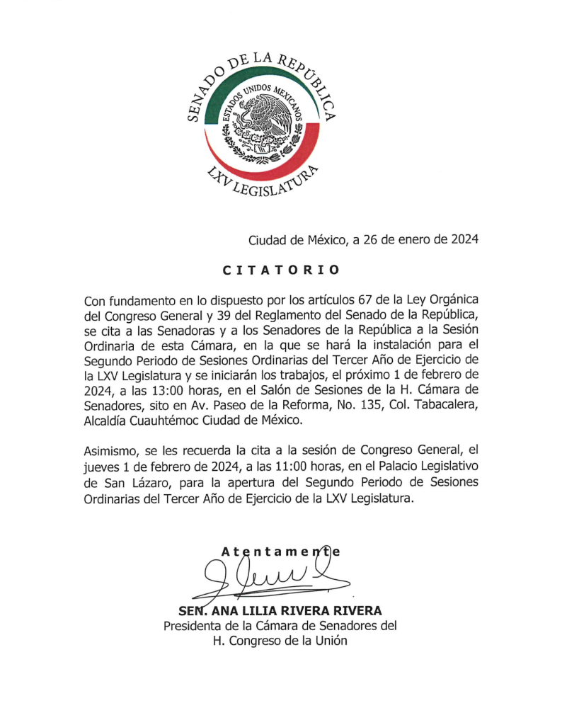 En el citatorio, que publicó Ana Lilia Rivera en la Gaceta Parlamentaria, también se recuerda a las y los integrantes de la Cámara de Senadores la cita para la sesión de Congreso General, que se realizará ese mismo día, a las 11:00 horas, en el Palacio Legislativo de San Lázaro, para la apertura del Segundo Periodo de Sesiones Ordinarias.