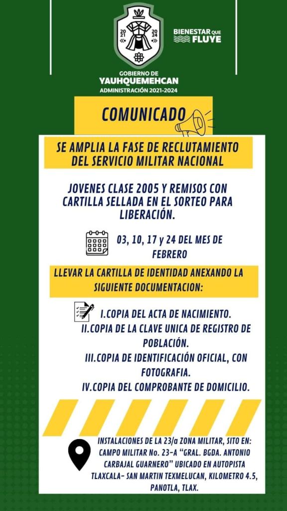 La Junta Municipal de Reclutamiento de Yauhquemehcan informa que se amplía el periodo de recepción de documentos para liberación de Cartillas de Identidad del Servicio Militar Nacional, como se informa a continuación. Para dudas pueden comunicarse al número 241 41 5 49 48 ext. 103.