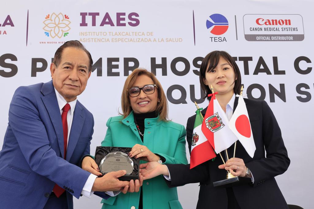 “Nunca escatimaré recursos para brindar a los tlaxcaltecas, lo mejor en equipamiento médico y de diagnóstico en beneficio de los tlaxcaltecas”, afirmó la gobernadora Lorena Cuéllar Cisneros al recibir de manos de la representante de Group Canon Medical Sistem, Rin Koyama el reconocimiento a la innovación tecnológica en el Instituto Tlaxcalteca de Asistencia Especializada a la Salud (Itaes).