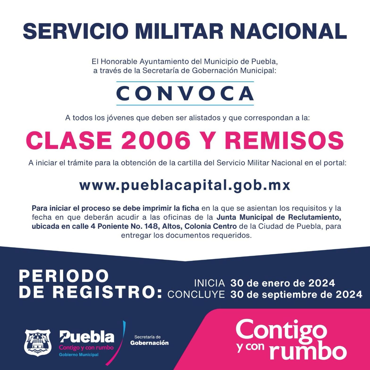 El Ayuntamiento de Puebla, a través de la Secretaría de Gobernación Municipal, convoca a todos los jóvenes clase 2006 y remisos que residen en la Ciudad de Puebla a que inicien su trámite para obtener la Cartilla del Servicio Militar Nacional.