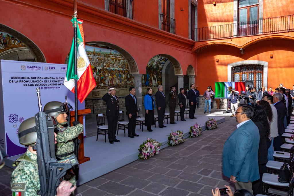 Autoridades de los tres poderes de gobierno en Tlaxcala encabezaron el acto cívico conmemorativo al 107 aniversario de la promulgación de la Constitución Política de los Estados Unidos Mexicanos.