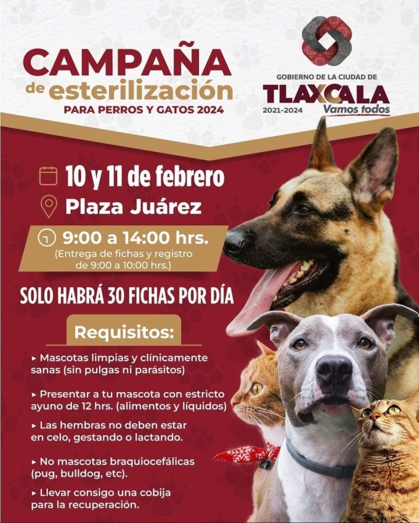 El Ayuntamiento capitalino invita a la ciudadanía a aprovechar esta campaña de esterilización gratuita de perros y gatos este 10 y 11 de febrero en la plaza Juárez.